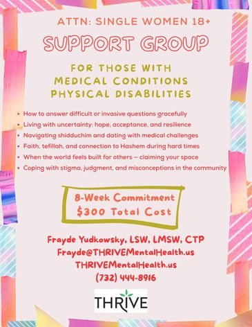 Medical & Physical Disability Support Group for Single Women 18+ This warm, empowering 8-week group is for single women living with medical conditions or physical disabilities. Together, we’ll explore topics like navigating dating, answering tough questions with grace, building faith and resilience, and finding your voice in a world not built with you in mind. Led by Frayde Yudkowsky, LSW, LMSW, CTP, the group offers a safe, supportive space to connect, heal, and grow.