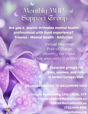 Monthly Support Group for Orthodox Jewish Mental Health Professionals with Lived Experience Are you a Jewish Orthodox mental health professional with your own journey through trauma, mental health, or addiction? Join this free, confidential monthly virtual support group designed just for you. Groups are offered separately for men, women,