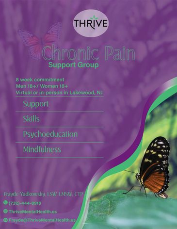 THRIVE! offers an all-encompassing support group. Join our 8-week skills-based, psychoeducational support group designed specifically for individuals living with chronic pain. Each session, whether in-person or virtual, lasts 1 hour and offers a nurturing environment where you can learn practical tools and strategies for managing pain and improving quality of life. We will be supporting one another, engaging in experiential exercises, gaining insight, sharing our experiences, learning techniques, getting to understand ourselves, learning how to live with our realities, and a whole lot more!